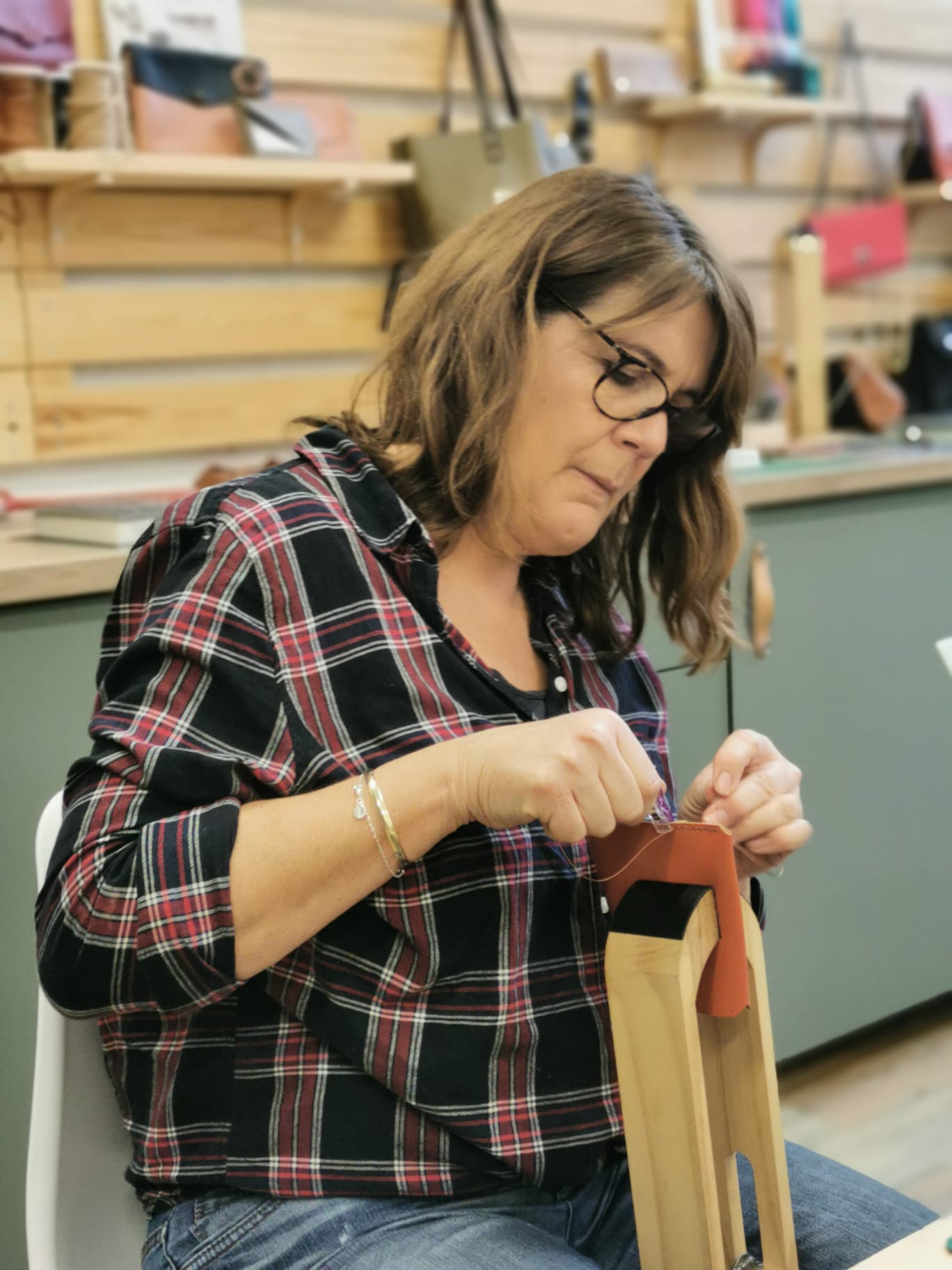 Dans son atelier à Serris en Seine-et-Marne, elle a souhaité créer un espace accueillant et convivial où chacun peut réveiller ses sens et échapper à la frénésie ambiante en découvrant la couture du cuir à la main et en créant une pièce unique personnalisée.