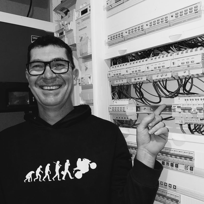 Samuel, électricien et mécanicien moto, a une formation initiale de technicien en automatisme et informatique industrielle. Après avoir travaillé quelques années dans les Télécoms, il crée donc son entreprise artisanale d'électricité générale du bâtiment. Il sert une clientèle locale de particuliers ainsi que d'entreprises chez lui dans l'Aveyron. Samuel aime le contact avec les gens et leur apporte son expertise technique sur tous leurs chantiers électriques.
