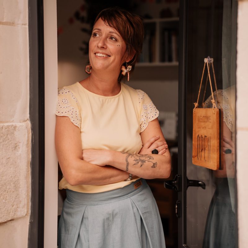 Depuis 2017, elle anime des ateliers et des formations de couture. Elle enseigne aujourd’hui la maroquinerie dans un lycée professionnel. Engagée pour une société inclusive. Elle conçoit et anime également des ateliers de couture adaptés, notamment auprès de jeunes porteurs de trisomie et en EHPAD.
