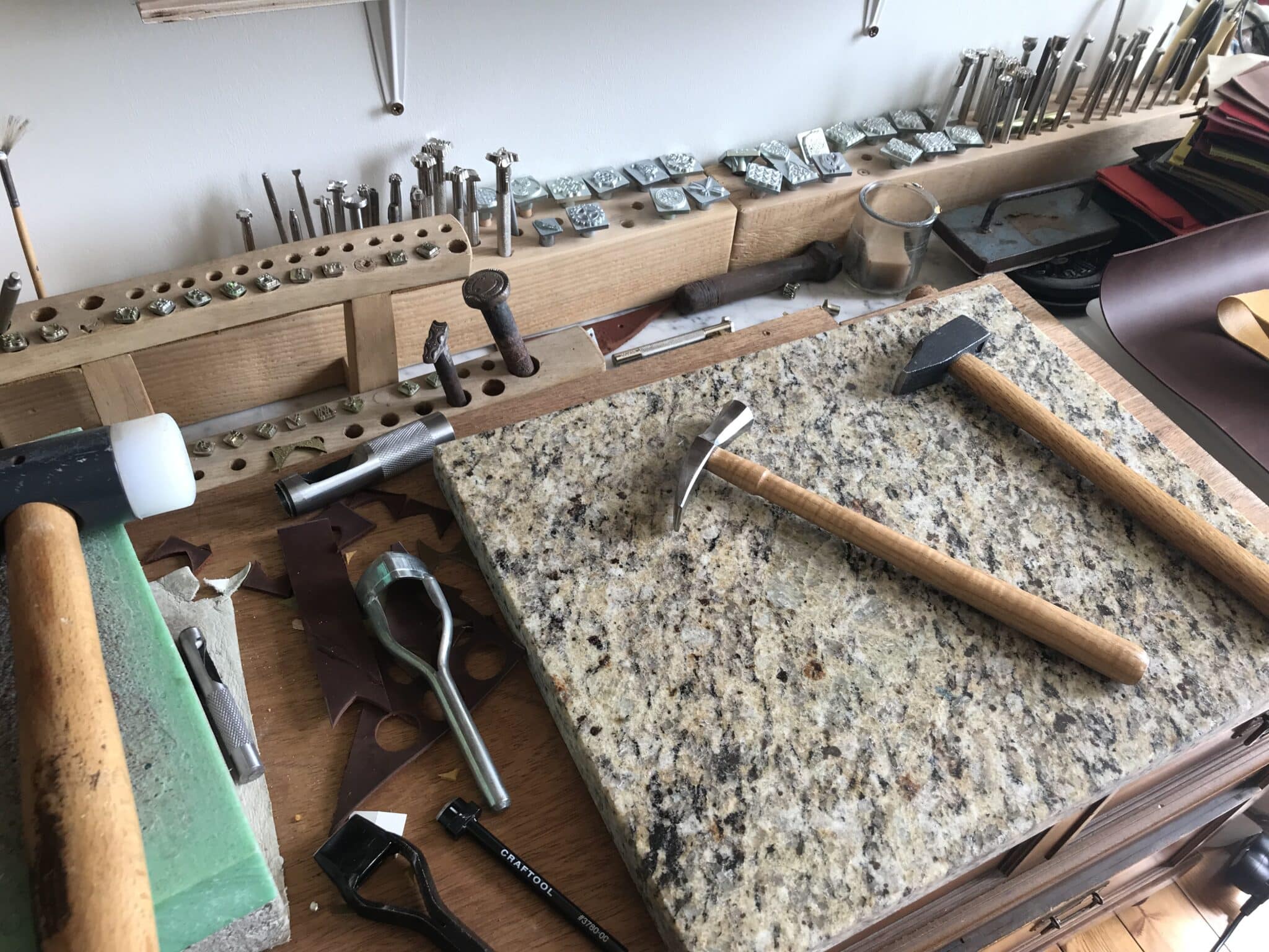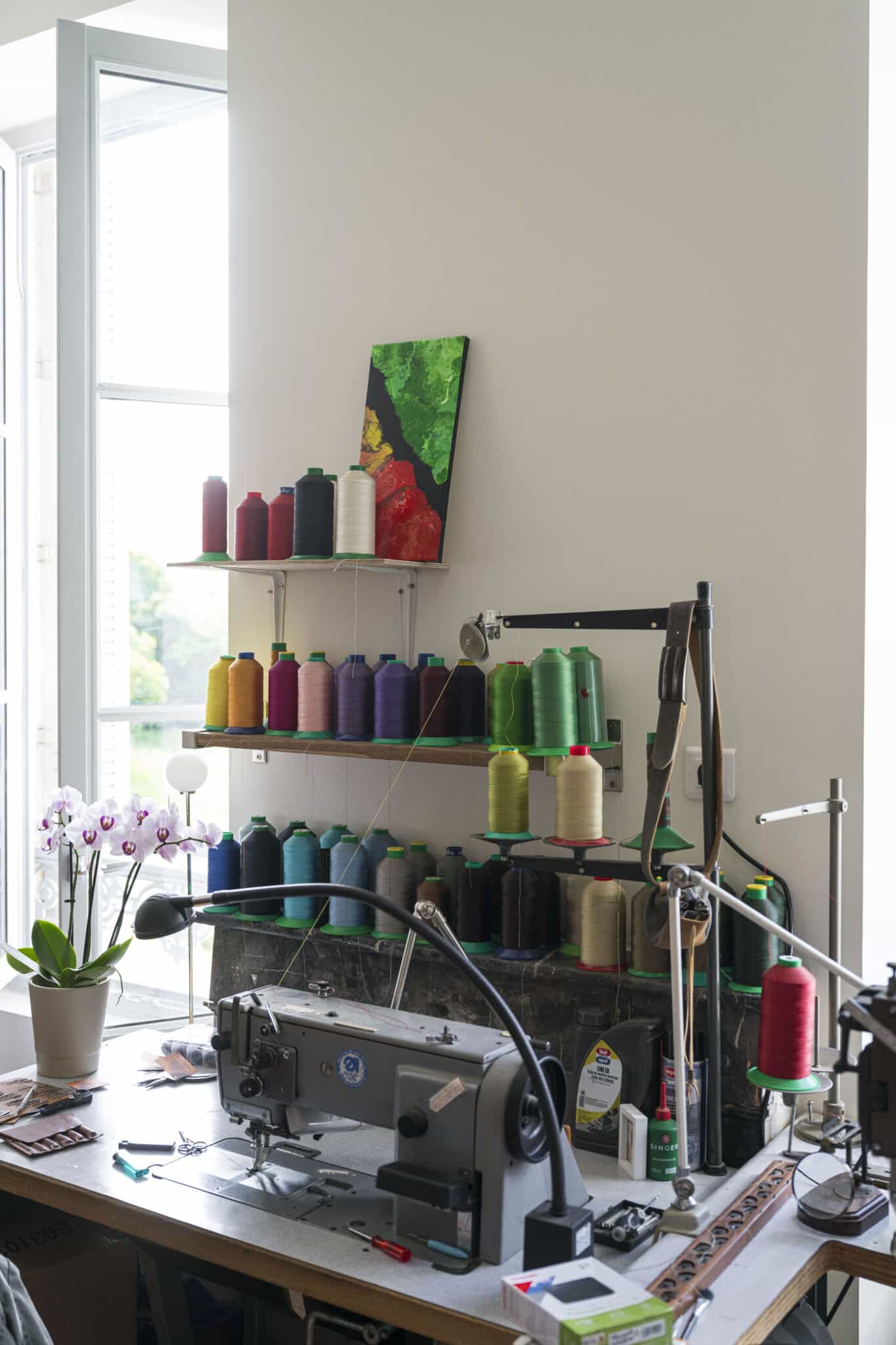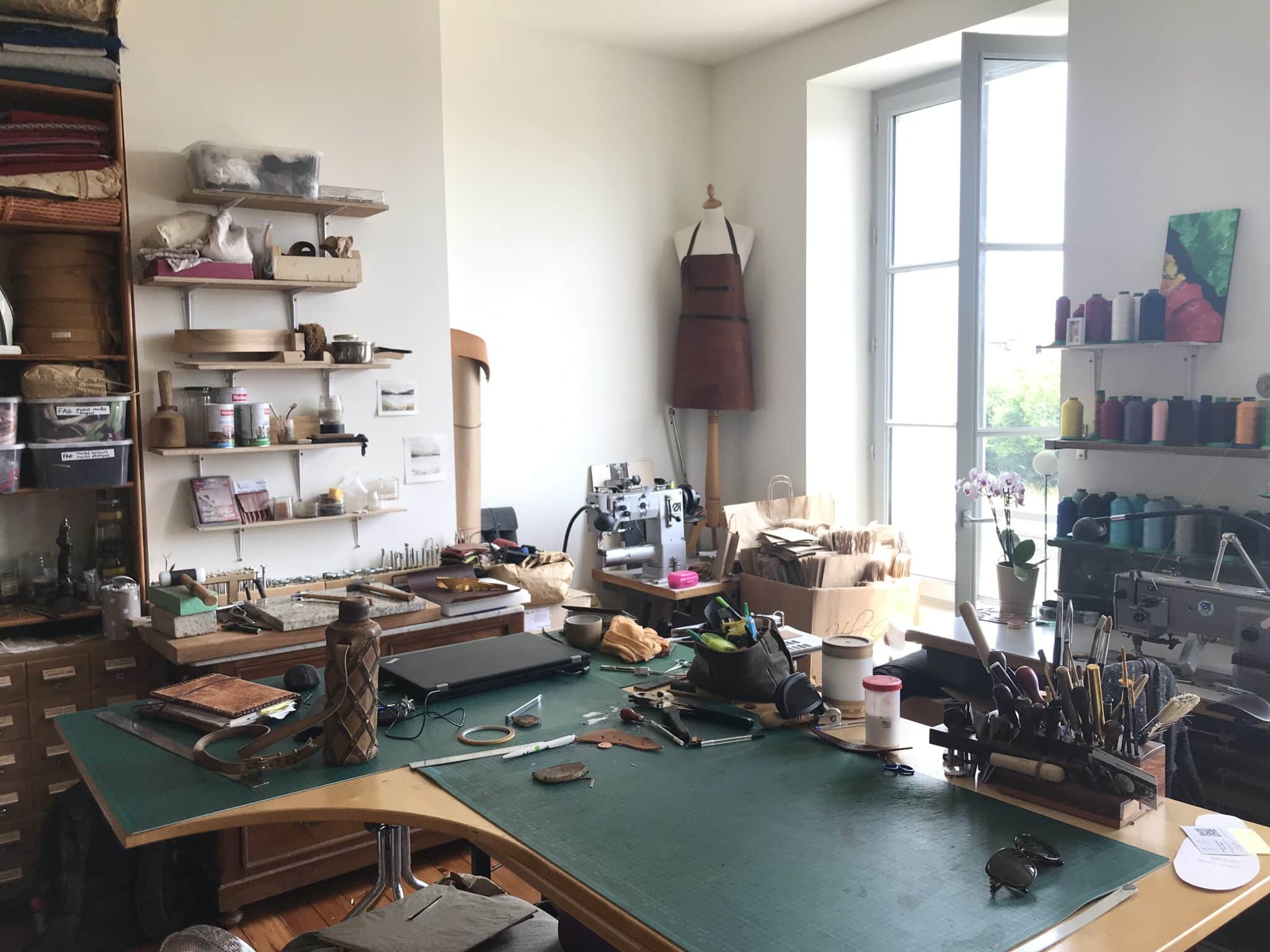 Son atelier de maroquinière se situe au sein du Tiers-Lieu métiers d’art La Manivelle Ô Vents près de Bordeaux en Gironde. Elle a co-fondé ce lieu avec d’autres collègues artisan.es d’art (ateliers partagés ainsi que boutique commune) il y a quelques années.